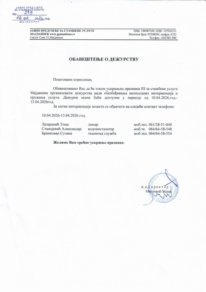 Javno preduzeće za stambene usluge Majdanpek obavestilo je građane da će tokom uskršnjih praznika organizovati dežurstva kako bi se obezbedile neophodne intervencije i kontinuitet usluga.