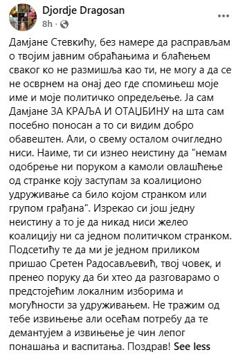 Nakon javnih obraćanja Damjana Stevkića u kojima je izneo tvrdnje o navodnoj neovlašćenoj koaliciji sa grupom građana „Ne dam“, oglasio se i Đorđe Dragošan, koji je te navode odlučno demantovao i potkrepio dokumentacijom.