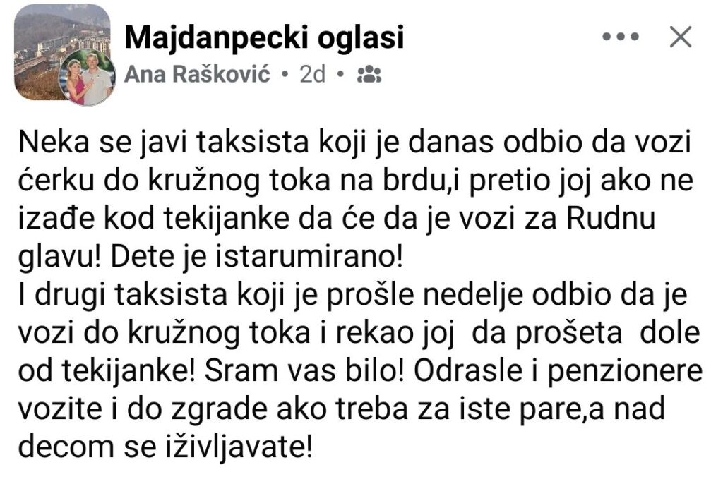 Objava jedne majke u Facebook grupi „Majdanpečki oglasi” izazvala je veliku pažnju i pokrenula raspravu među građanima o načinu funkcionisanja taksi usluga u Majdanpeku.