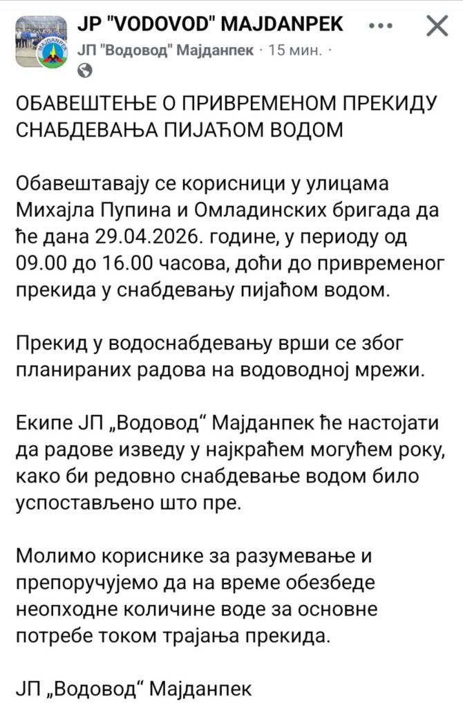 JP „Vodovod“ Majdanpek obavestilo je građane da će u sredu, 29. aprila 2026. godine, doći do privremenog prekida u snabdevanju pijaćom vodom u pojedinim delovima grada.