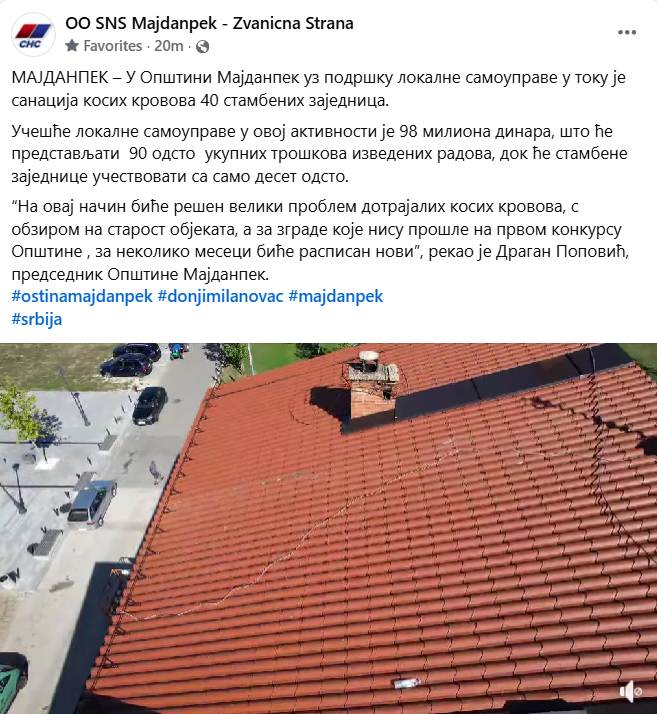 Da objasnimo. 90% troškova za saniranje kosih krovova pokriva lokalna samouprava, ostatak novca pokrivaju stambene zajednice. Niti jedan dinar nije došao sa strane Opštinskog odbora Srpske napredne stranke, što bi njima u ovom slučaju dalo bilo kakvo pravo da se reklamiraju koristeći ovu vest.