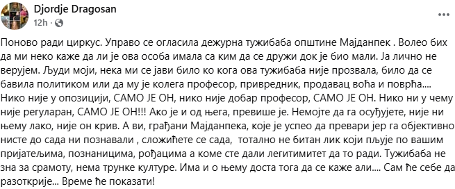 Dragošan je, između ostalog, naveo da Stevkić konstantno proziva različite ljude iz lokalne zajednice, tvrdeći da „niko nije u opoziciji osim njega“ i da „niko nije dovoljno dobar osim njega“. On je ocenio da je reč o osobi koja, kako navodi, „nema meru u javnim nastupima“, te poručio građanima da sami procene njegov kredibilitet.