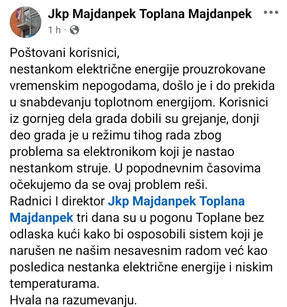 Usled nestanka električne energije izazvanog vremenskim nepogodama, došlo je do prekida u snabdevanju toplotnom energijom u Majdanpeku, saopštili su iz Javnog komunalnog preduzeća „Toplana Majdanpek“ na društenoj mreži fejzbuk.