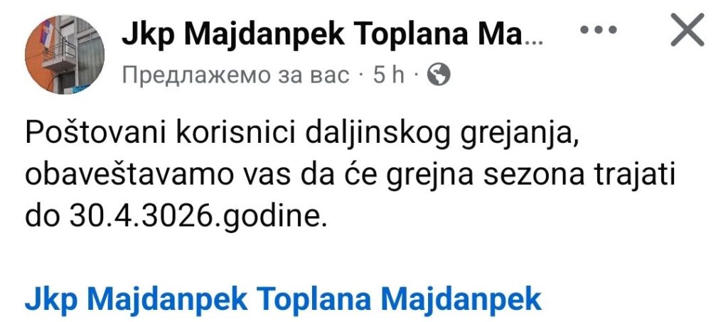 Javno komunalno preduzeće „Toplana Majdanpek“ obavestilo je korisnike daljinskog grejanja da će grejna sezona trajati do 30. aprila.