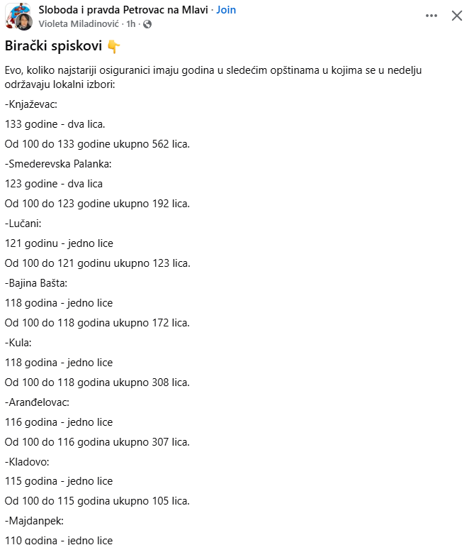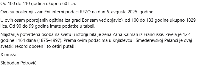 Prema dostupnim podacima, u više opština evidentiran je neuobičajeno veliki broj osiguranika starijih od 100 godina, uključujući i slučajeve koji premašuju zvanično zabeleženi svetski rekord dugovečnosti.