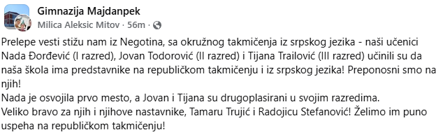 Iz Gimnazije u Majdanpeku ističu da su ponosni na postignute rezultate i svojim učenicima žele mnogo uspeha na predstojećem republičkom takmičenju.