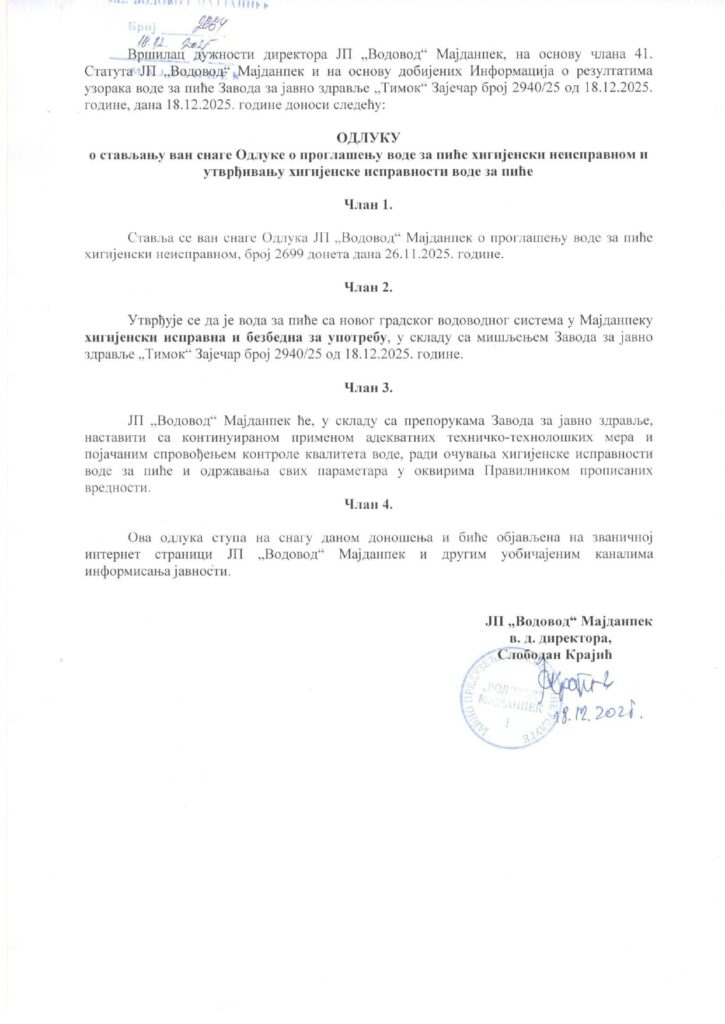 Odluku je 18. decembra 2025. godine doneo vršilac dužnosti direktora JP „Vodovod“ Majdanpek, na osnovu rezultata ispitivanja uzoraka vode koje je sproveo Zavod za javno zdravlje „Timok“ iz Zaječara. U pitanju su analize označene brojem 2940/25, koje potvrđuju da su svi parametri kvaliteta vode u skladu sa važećim propisima.